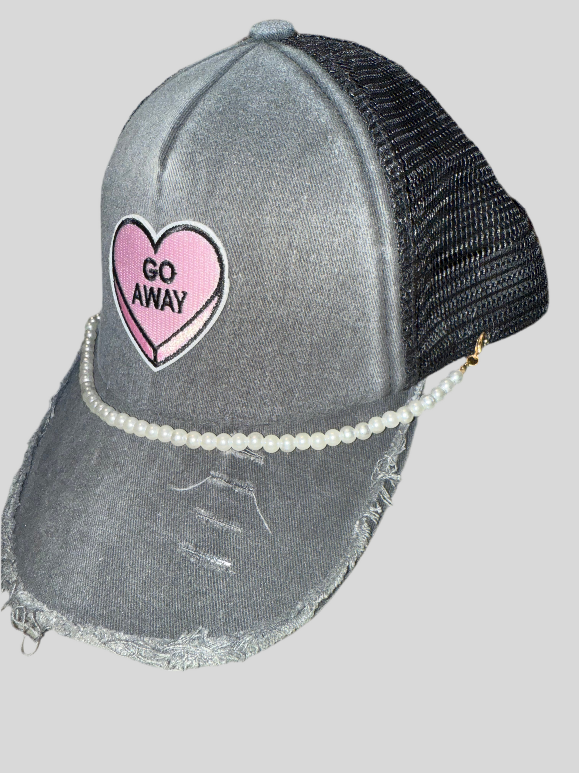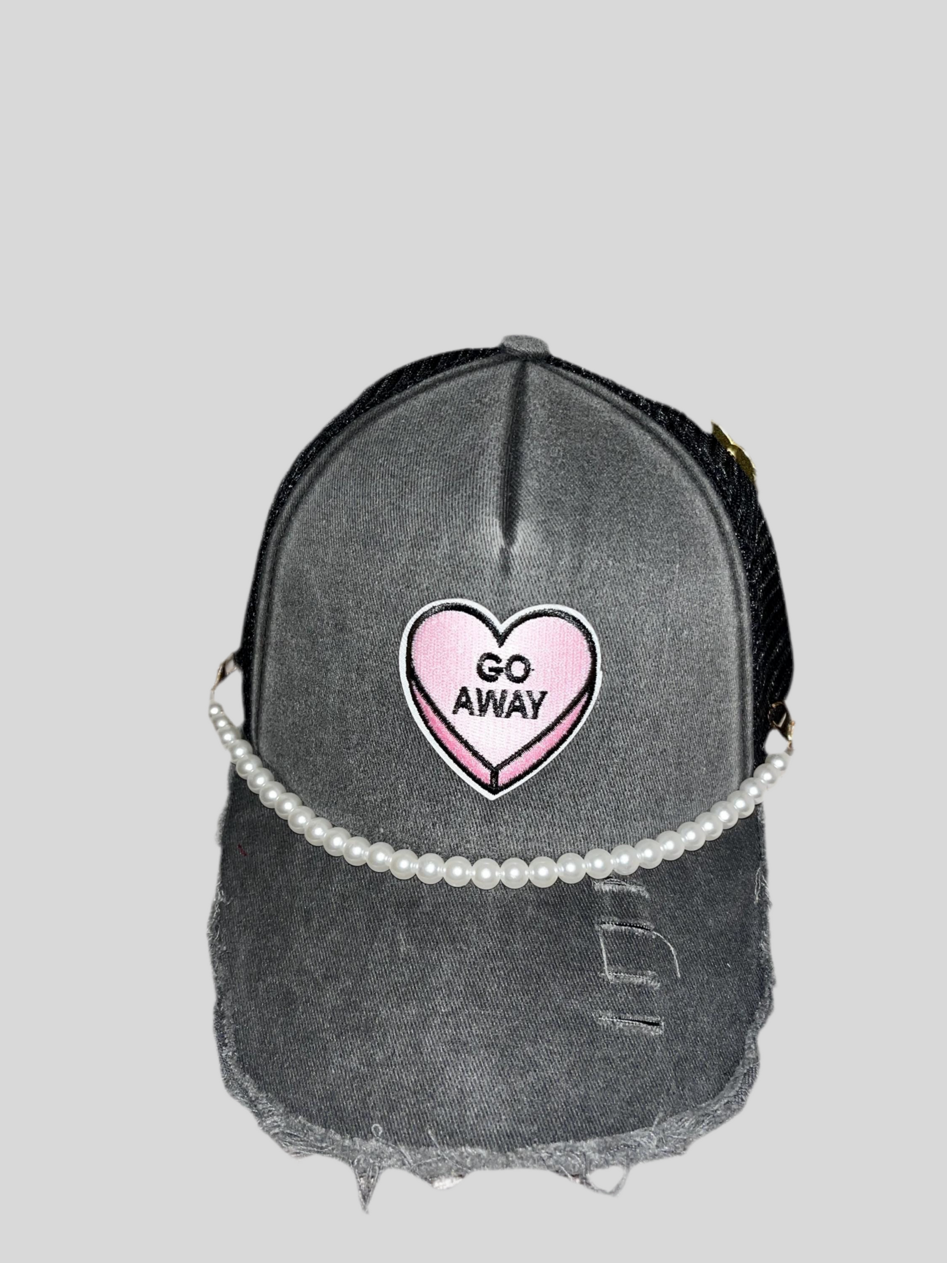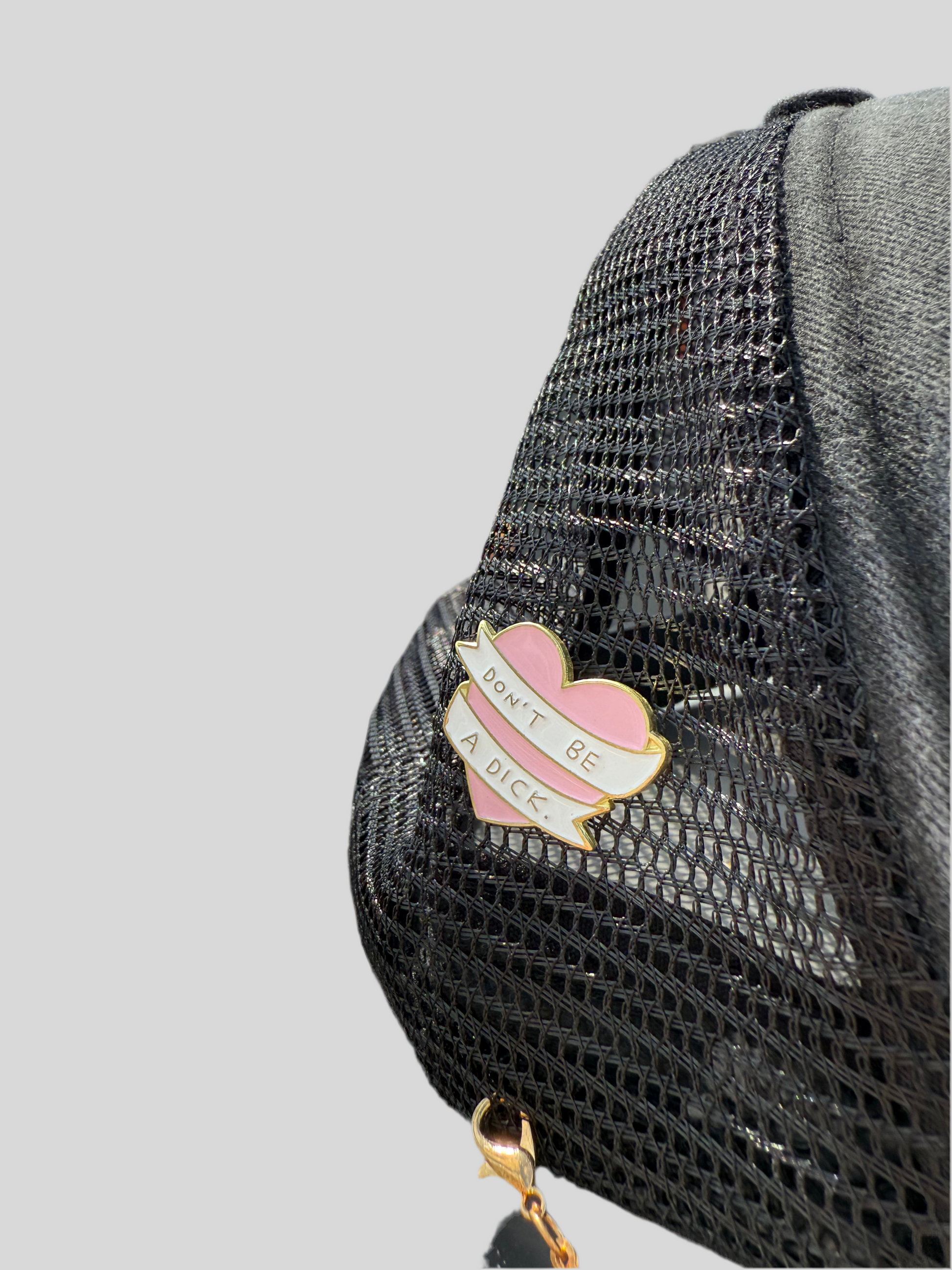 Straight and to the point. The hat that no one will try to small talk you in. It’s adjustable and has a detachable chain. The pin on the side says “don’t be a dick”